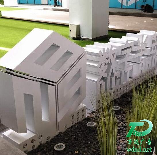 綜合了不銹鋼及鋁字的工藝,最大的突破是文字自身發(fā)光,晚間照明無需要借助外打光,具體做法是把文字筆畫鏤空,換以透光亞克力板材,在文字內(nèi)腔裝上冷光源(日光管)或霓紅燈,這樣它在白天就可以利用色彩的自然對比效果,而晚上就像是自身發(fā)光,周邊墻體又無外照明引起的光斑,文字效果相當(dāng)明顯,但缺點是成本較高,維護(hù)也略復(fù)雜,要借肋吊船等工具反把外面板卸去才能更換光源。