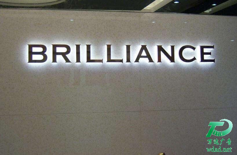 綜合了不銹鋼及鋁字的工藝,最大的突破是文字自身發(fā)光,晚間照明無需要借助外打光,具體做法是把文字筆畫鏤空,換以透光亞克力板材,在文字內(nèi)腔裝上冷光源(日光管)或霓紅燈,這樣它在白天就可以利用色彩的自然對比效果,而晚上就像是自身發(fā)光,周邊墻體又無外照明引起的光斑,文字效果相當(dāng)明顯,但缺點是成本較高,維護(hù)也略復(fù)雜,要借肋吊船等工具反把外面板卸去才能更換光源。